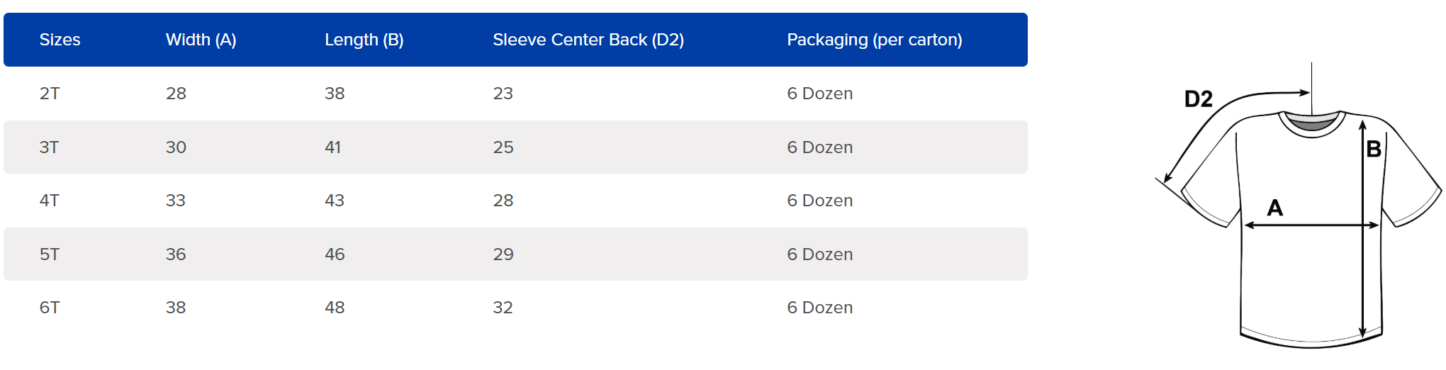 • 2T is equivalent to size S up to 6T is 2XL